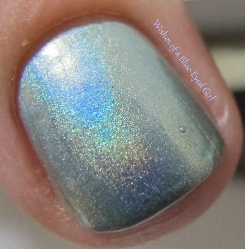 Honestly?  I don't really know why I put this guy in here...  It's much darker than the rest and is a true teal versus the others' minty qualities.  Application was easy, even though I only have a decant of it in a mini bottle.  This one has been long discontinued and is very very hard to find.  I am very lucky that I was able to swap a decant of one of my Enchanteds for this bad boy.  The holographic particle size is around the same as Blue Moon Lagoon, but there's more of it, which makes the rainbow a little more pronounced.